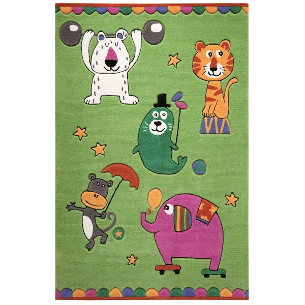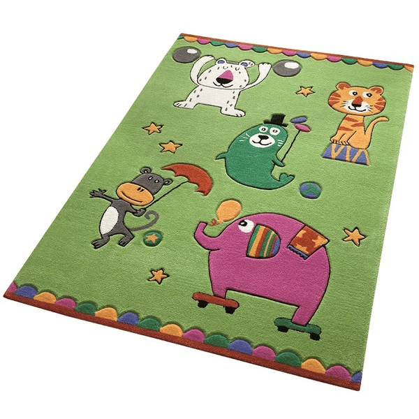 Jongleure und Artisten, Tiere und Sensationen – auf diesem kunterbunten Kinderteppich ist ordentlich was los! Und wenn Kids vom vielen Gucken ganz müde geworden sind, schnappen sie sich einfach ein Kissen und gönnen sich auf der weichen Spielinsel eine kleine Ruhepause. Lieferbar in drei Farben und drei Größen. Handtuft aus 100% pflegeleichtem Acryl, Florhöhe: 10 mm. Nach Ökotex zertifiziert.